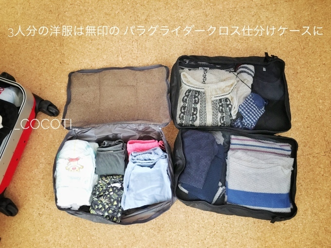 洋服は1人ずつ無印のパラグライダークロスたためる仕分けケースに。(無印良品は