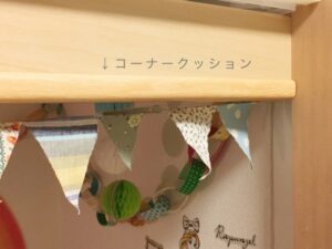 ホームセンターで、コーナークッションを買ってきて内側と外側両方に貼り付けています。