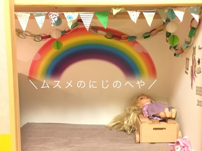 ガーランドを飾ったり、ウォールステッカーを貼って、ムスメの好きなお部屋に一緒に飾りつけ。