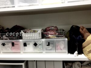引き出しに着ていく私服や下着、カゴに制服をポイポイ、右横のスペースに通園バッグを。
