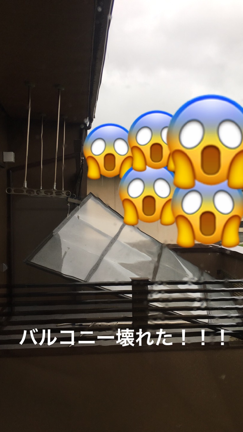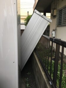 2階のバルコニーの屋根を支える柱が捥がれ、吹っ飛んで、敷地内の物置に当たって物置を倒す。その弾みにバルコニーの床を破る。バルコニーの屋根が崩れる。