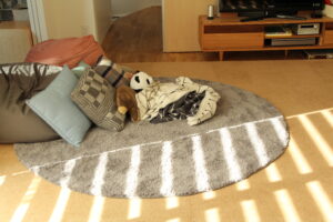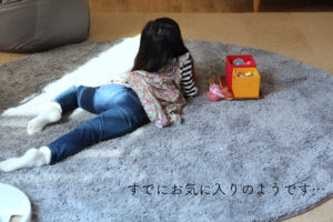 ということで、今年もその上に新しいラグを!初めての円形のラグです!さぁ、家族の反応やいかに!?