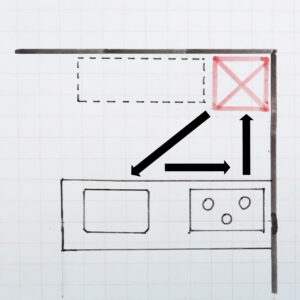 これらを結んだときに線がぞれぞれ短いほうがお料理の際の動線が短くなりますよ。