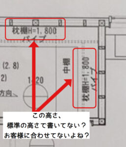 [chat face=”man1″ name=”HMさん” align=”left” border=”gray” bg=”none” style=””]収納の中だから、いつもと同じ(標準の仕様・高さ)でいいかなと思って。[/chat]多分これがHMさんのご意見。